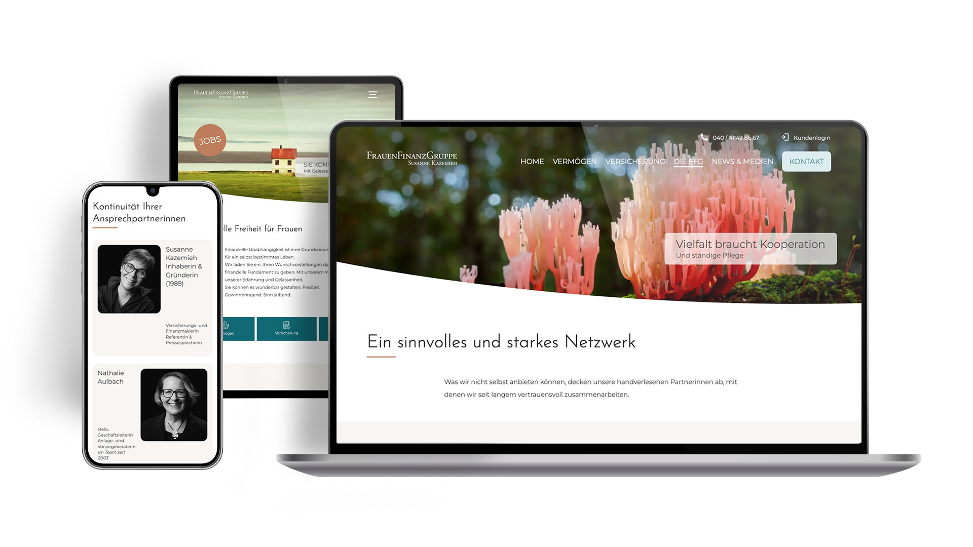 Die Frauenfinanzgruppe wurde gegründet, um einem alten Missstand abzuhelfen: Finanzen waren viel zu lange eine Männerdomäne. Gründerin Susanne Kazemieh erkannte den Handlungsbedarf und gründete 1989 die FrauenFinanzGruppe. In einem Team von zehn Mitarbeiterinnen berät sie Frauen zu Themen wie Geldanlage, Altersvorsorge, Erbe und Versicherungen.